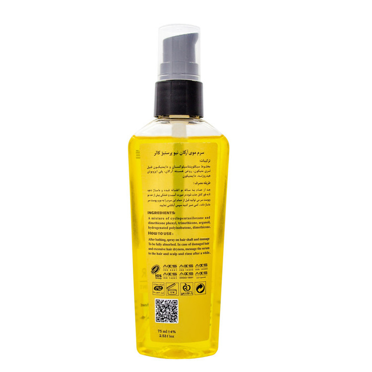 سرم موی روغن آرگان گیاهی نیو پرستیژ به عنوان یک درمان برای مو استفاده میشود. این محصول برای تقویت ریشه مو و رشد سریع مو بسیار موثر است و معمولا به عنوان یک نرم کننده استفاده میگردد. این سرم مو مزایای زیادی برای موها دارد. همچنین این محصول قادر است به عنوان یک مرطوب کننده برای پوست سر، مبارزه با شوره و پوست سر خشک عمل کند. سرم مو پرستیژ میتواند باعث رشد و قوی شدن موهای نازک شود و موهای شکننده را از میان ببرد.حتی میتواند برخی از آسیبهای انجام شده از طریق درمانهای شیمیایی، رنگ و یا دکلره را درمان کند. در ترکیبات این سرم از روغن آرگان، روغن بادام، روغن نارگیل، کراتین و ویتامین E استفاده شده است. روغن آرگان به عنوان یک مرطوب کننده و آبرسان قوی کاربرد داشته و ویتامین E و اسیدهای چرب آن باعث میشوند تا مو رطوبت و شادابی خود را حفظ نماید. روغن آرگان به خوبی موخوره و وز مو را از بین میبرد و باعث میشود مو سالم، براق و درخشنده و حالت پذیر شود. وجید اسید هیالورونیک در روغن آرگان باعث آبرسانی و حفظ رطوبت مو شده و آن را صافتر و نرمتر میکند. همچنین این روغن باعث کاهش التهاب پوست سر شده و خاصیت آنتی اکسیدانی آن باعث بهبود آسیبهای وارد شده به پوست سر میگردد. استفاده مداوم از این روغن باعث تنظیم ترشح چربی پوست سر نیز میگردد. این روغن مقاومت مو را در برابر دستگاههای حرارتی مانند سشوار و اتو مو افزایش داده و به عنوان یک درمانگر موقت کاربرد نداشته بلکه یک همراه همیشگی برای حفظ ریبایی شماست. ویتامین E موجود در سوم موی پرستیژ باعث افزایش رشد مو شده و به عنوان یک آنتی اکسیدان قوی برای تقویت و رشد مجدد مو تاثیر شگرفی دارد. جهت استفاده از این محصول توصیه میشود بعد از حمام به موهای مرطوب یا خشک ماساژ داده تا به طور کامل جذب مو شود.